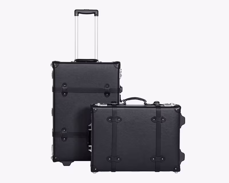 Lovingly crafted by hand, both wheeled suitcases utilise materials with impeccable technical specifications. For lightweight yet sturdy construction, each case is built from vulcanised fibre board, recycled bonded leather, top grain leather, canvas, recycled Pasco wood, vegan leather and brushed metal hardwear. In tonal black and chrome, the result fuses pared-back modernity with elegant masculinity, offering the fabled fusion of fashion, function and timeless good looks.