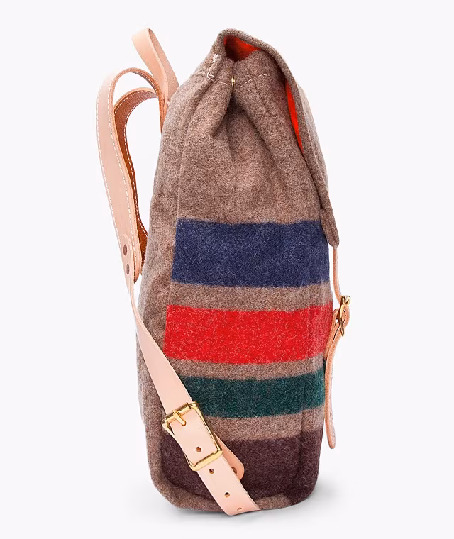 Yuketen presents their latest Striped Wool Canoe Backpack, constructed from gray wool material and nude leather trimmings. Made entirely in the USA, this item is minimalist yet functional, blue, red, green, and charcoal thick stripes accent the exterior, while the inner lining uses bright orange canvas material. All of the metal details on the backpack are coordinated in brass color, complementing the natural leather tone. Affixed on the top cover flap is a stamped leather logo patch, which results in a less-than-subtle branding.